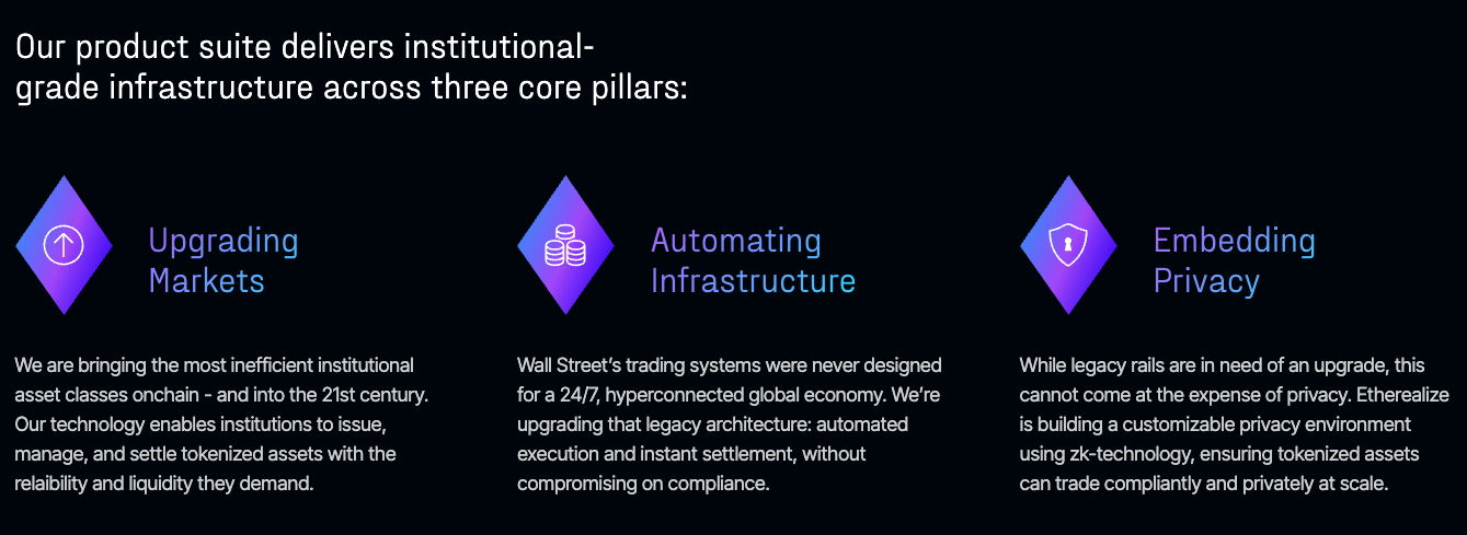Etherealize 对自身的介绍惜字如金,在 X 简介上称自己为「以太坊生态的机构级产品、BD 和市场部门」,而网站上也只有「重塑华尔街」与「通过提供研究、内容与产品来将世界带入以太坊」的愿景。产品方面,Etherealize 瞄准了机构级基础设施,提供代币化资产的发行、管理、结算以及相应的自动化合规基础设施,并计划通过零知识证明引入隐私功能。