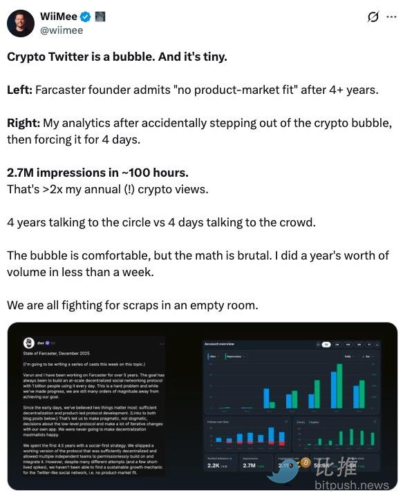 在一次“意外跳出加密内容圈层”后,Wiimee 连续四天面向泛人群创作内容,其分析数据显示,在约 100 小时内获得了 270 万次曝光,超过他一年内全部加密内容浏览量的两倍。
