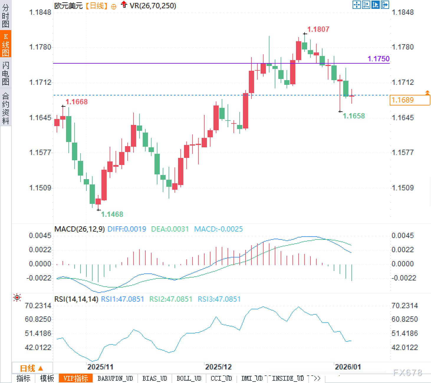 技术面上,欧元兑美元曾在1.1807遇阻回落,显示出上方抛压较重。1.1750附近已成为多空分水岭,若不能有效突破并站稳,反弹大概率只是修正而非趋势反转。而下方1.1658则在近期被测试,展现出一定支撑作用。目前汇价虽仍高于该位,但距离不远,一旦波动放大,容易触发技术性卖盘。MACD指标显示短期动能转弱,DIFF为0.0019、DEA为0.0031、MACD柱为-0.0025,RSI约47.0851,处于中性偏弱区间,说明市场尚未超卖,仍有下行空间。