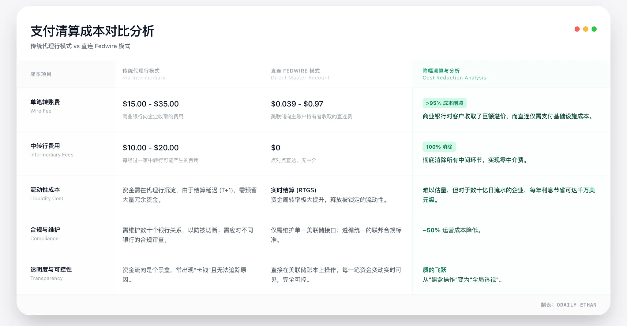 获得主账户对支付成本的削减是结构性的,而非边际性的。其核心原理在于,直连美联储支付系统(如 Fedwire)彻底绕过了传统代理银行的多层中介,从而消除了相应的中间费用和加价。